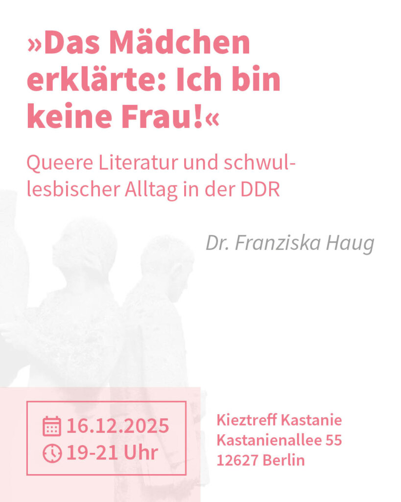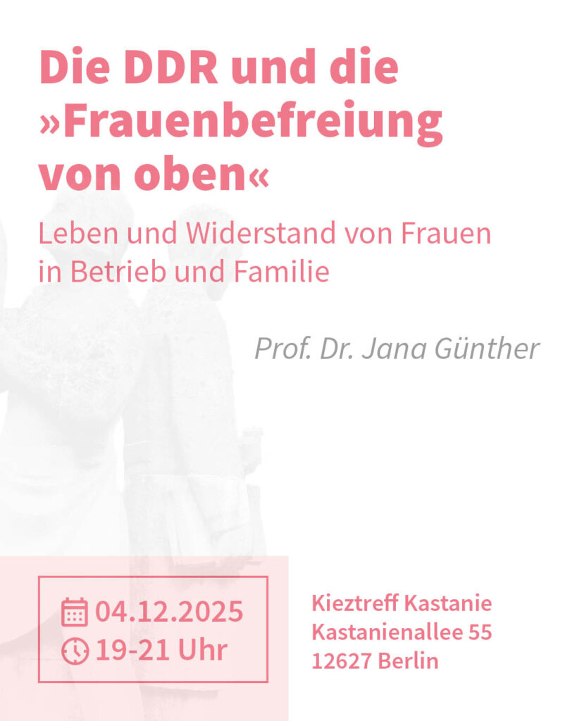 Eine Veranstaltungsreihe der Koordinierungsstelle für Demokratieentwicklung Marzahn-Hellersdorf im Kieztreff Kastanie (Kastanienallee 55, 12627 Berlin) über staatlich verordnete Gleichstellung der Geschlechter, feministische Bewegungen und queeres Leben im “real existierenden Sozialismus“.